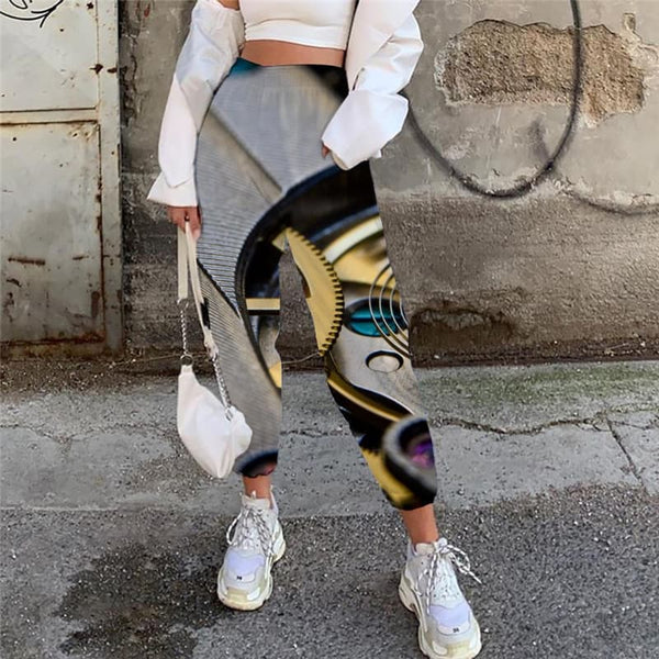 Metal Trousers Women Engine 3d Printed Gear High Waist Pants Punk Rock Casual Pant
