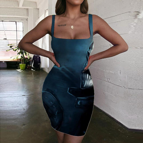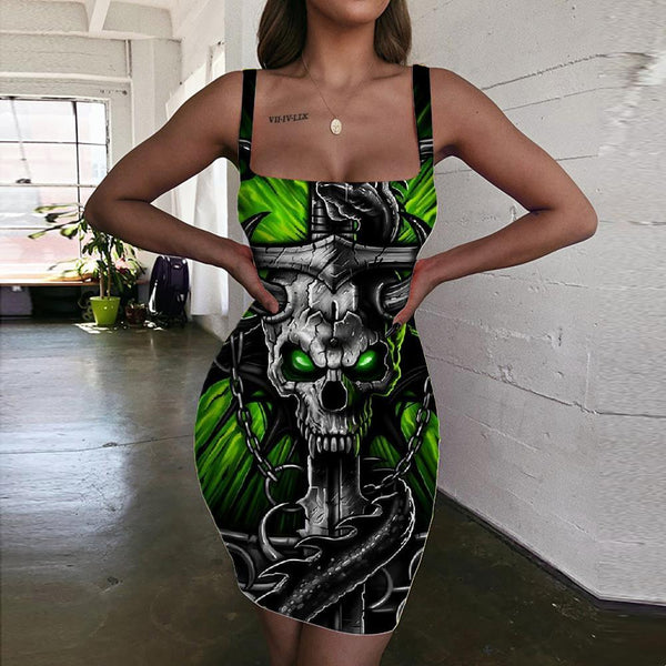 Skull Dress Women Punk Ladies Dresses Flame Party Iron Chain sleeveless
