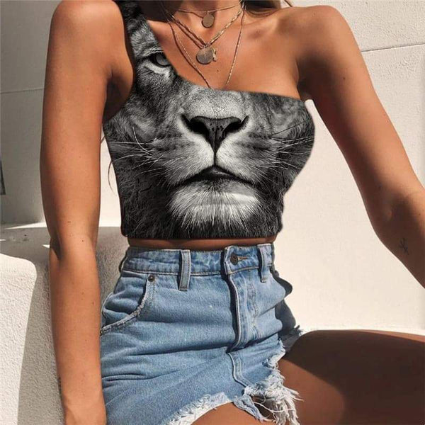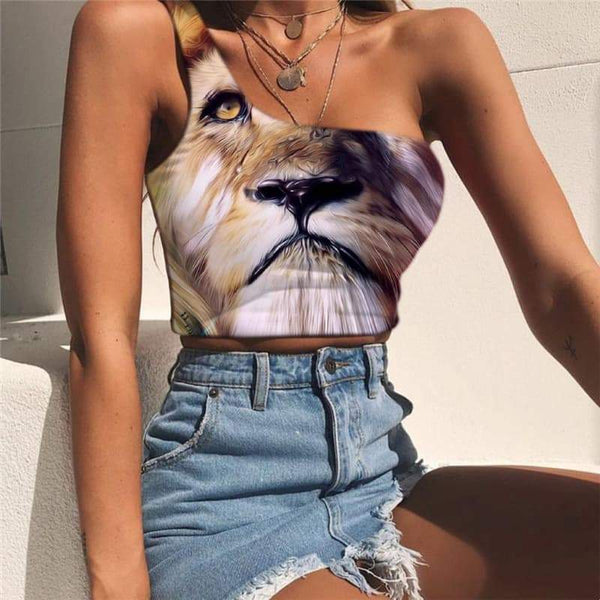 Lion Vest Tops Women Animal Tees Graphic Anime One Shoulder Crop Harajuku Midri...