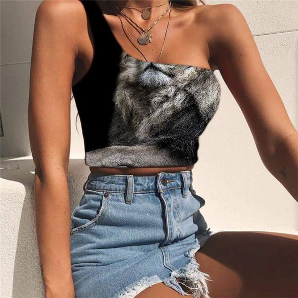 Lion Vest Tops Women Animal One Shoulder Crop Anime Sleeveless Shirt Black Midr...