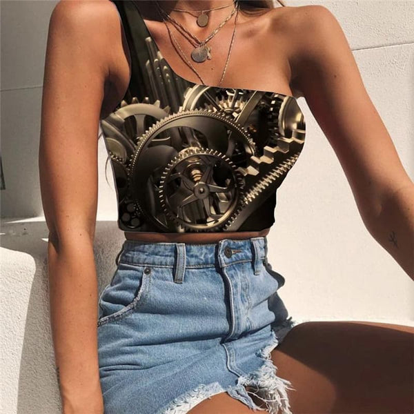 Metal Vest Tops Women Engine One Shoulder Crop Gear Tees Graphic Technology Sle...