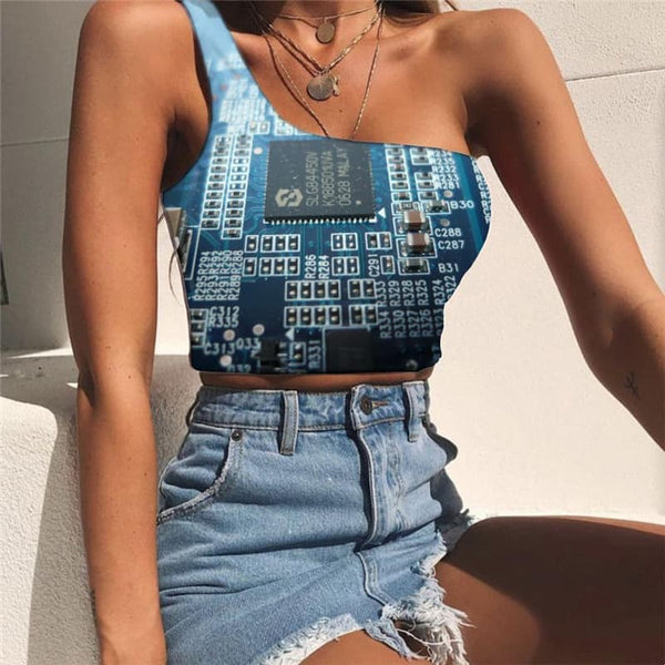 Motherboard Tank Tops Women Technology Midriff T shirt Letter One Shoulder Crop...