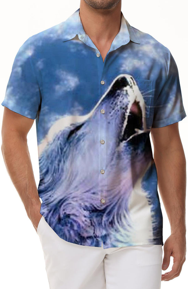 Silver Grey Animal Fur Wolf Head Tropical Ocean Hawaiian Button Shirt Short Sle...