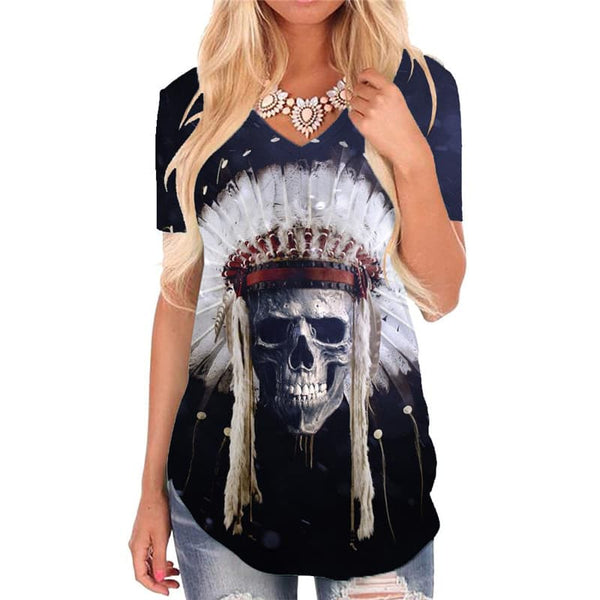Skull T-shirt women Punk Tshirts Printed Indian Shirt Print Feather V-neck Tshirt