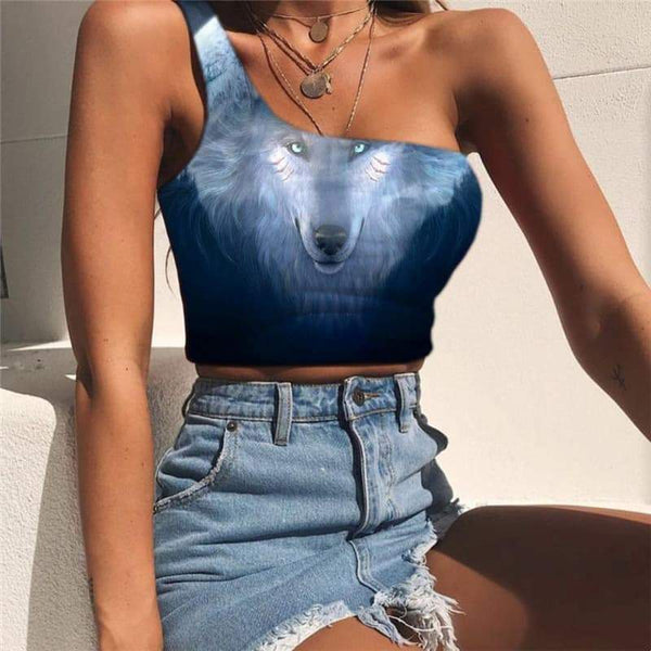 Wolf Tank Tops Women Animal One Shoulder Crop Anime Midriff T shirt Psychedelic...