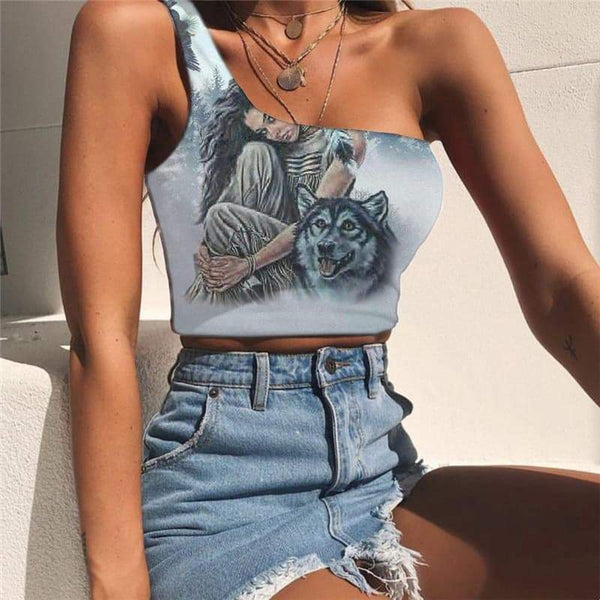 Indios Vest Tops Women Wolf Tees Graphic Eagle One Shoulder Crop Lovely Midriff...