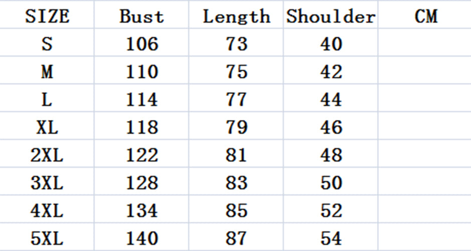 XXXXXL:Bust 140cm,  Length 87cm, Shoulder 54cm