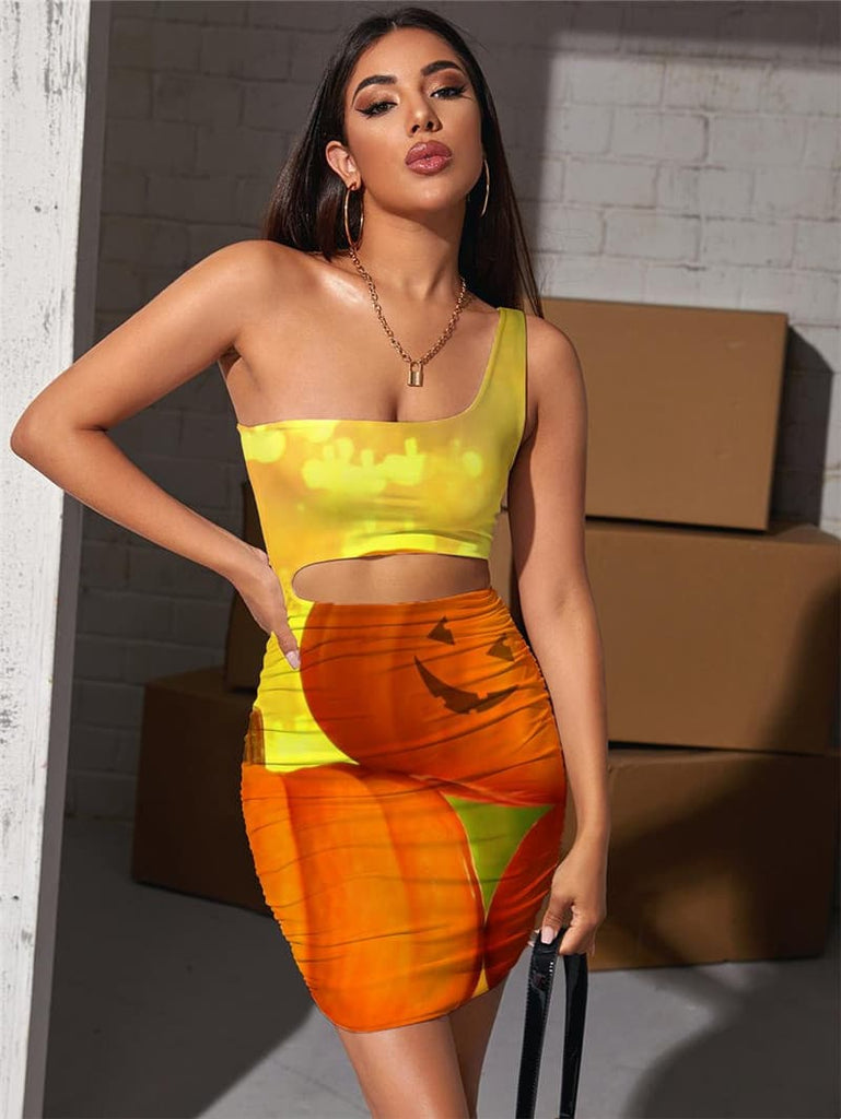 Pumpkin Dresses Women Halloween Halter Sleeveless Funny Bodycon Dress Harajuku Hollow out Dresses