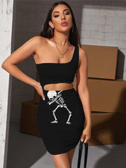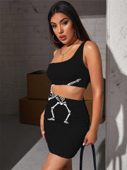 Skull Dresses Women Skeleton Halter Sleeveless Dancing Pleating Rock Vestido Sexy