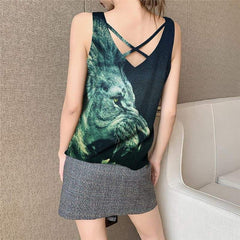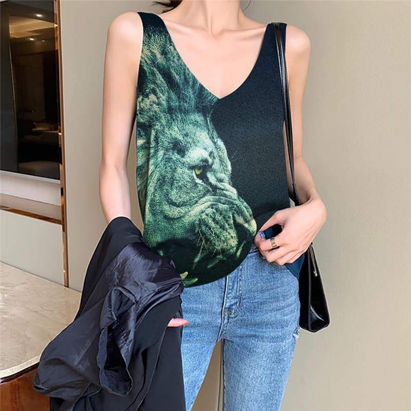 Lion Tank Top Women Animal Funny Top Anime Anime Clothes Green Vest Print Ferocious Sleeveless 3d - KYKU