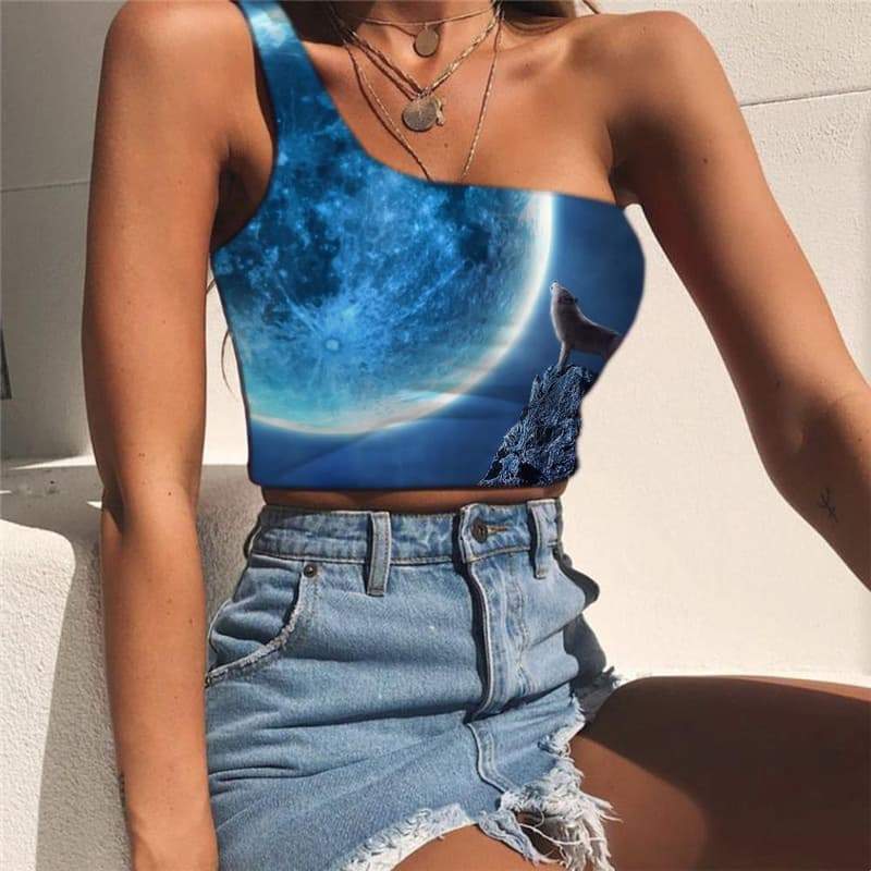 Animal TopsAnime clothingCloud Vest TopsFemaleGymMidriff T shirtOne Shoulder CropSummerTees GraphicWolf Tank Tops