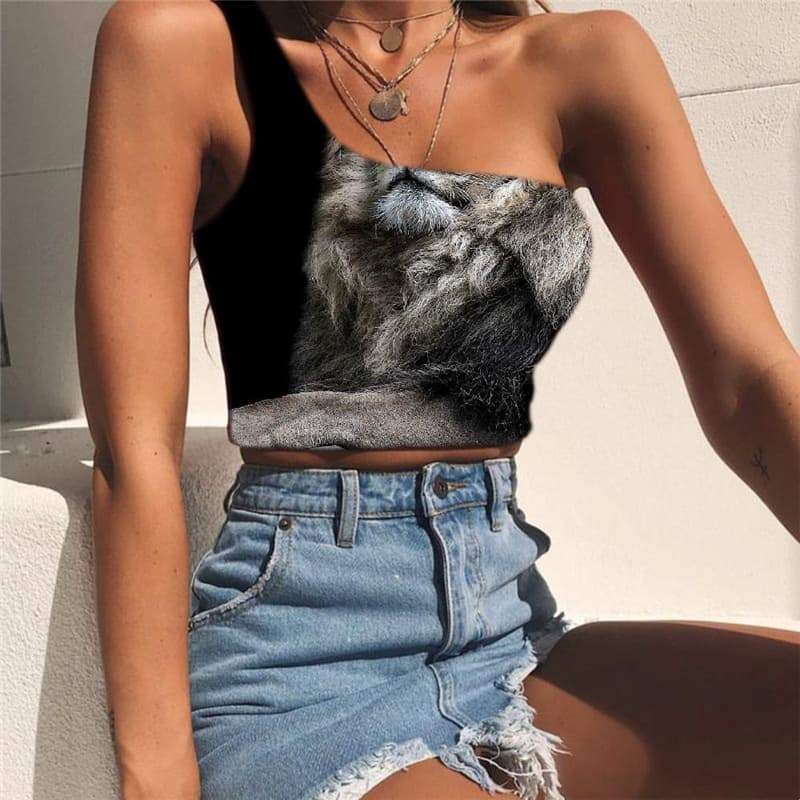 Lion Vest Tops Women Animal Tees Graphic Anime One Shoulder Crop Harajuku Midriff T shirt Lively Sleeveless Shirt - KYKU