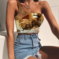 Lion Vest Tops Women Animal Midriff T shirt Anime One Shoulder Crop Lovely Tees Graphic Family Sleeveless Shirt