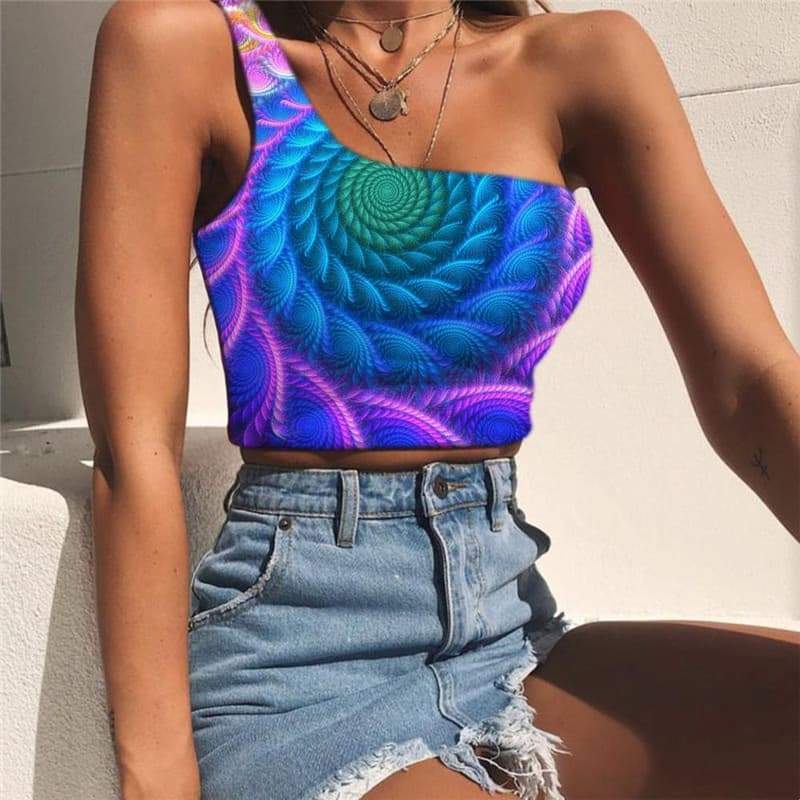 Color Vest TopsFemaleGeometric clothesLadyMidriff T shirtOne Shoulder CropPsychedelic clothesSlimTees GraphicVortex Tank Tops